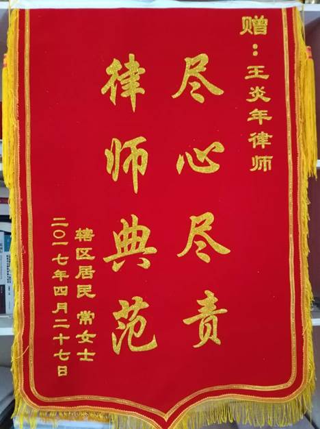 2017年5月3日上午10點左右,當(dāng)事人李某的母親來到河南恒翔律師事務(wù)所,向我所王炎年律師贈送錦旗,錦旗上寫著“盡心盡責(zé) 律師風(fēng)范”。